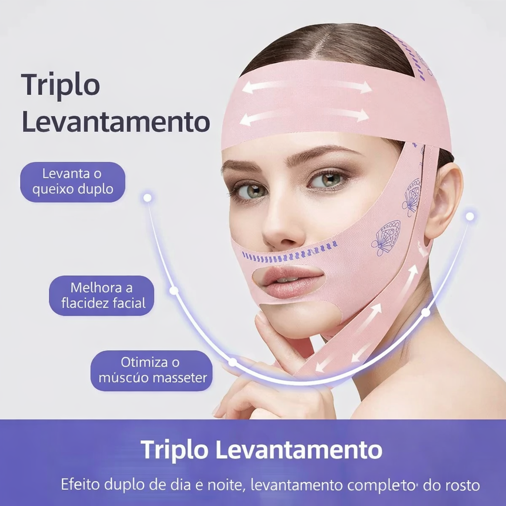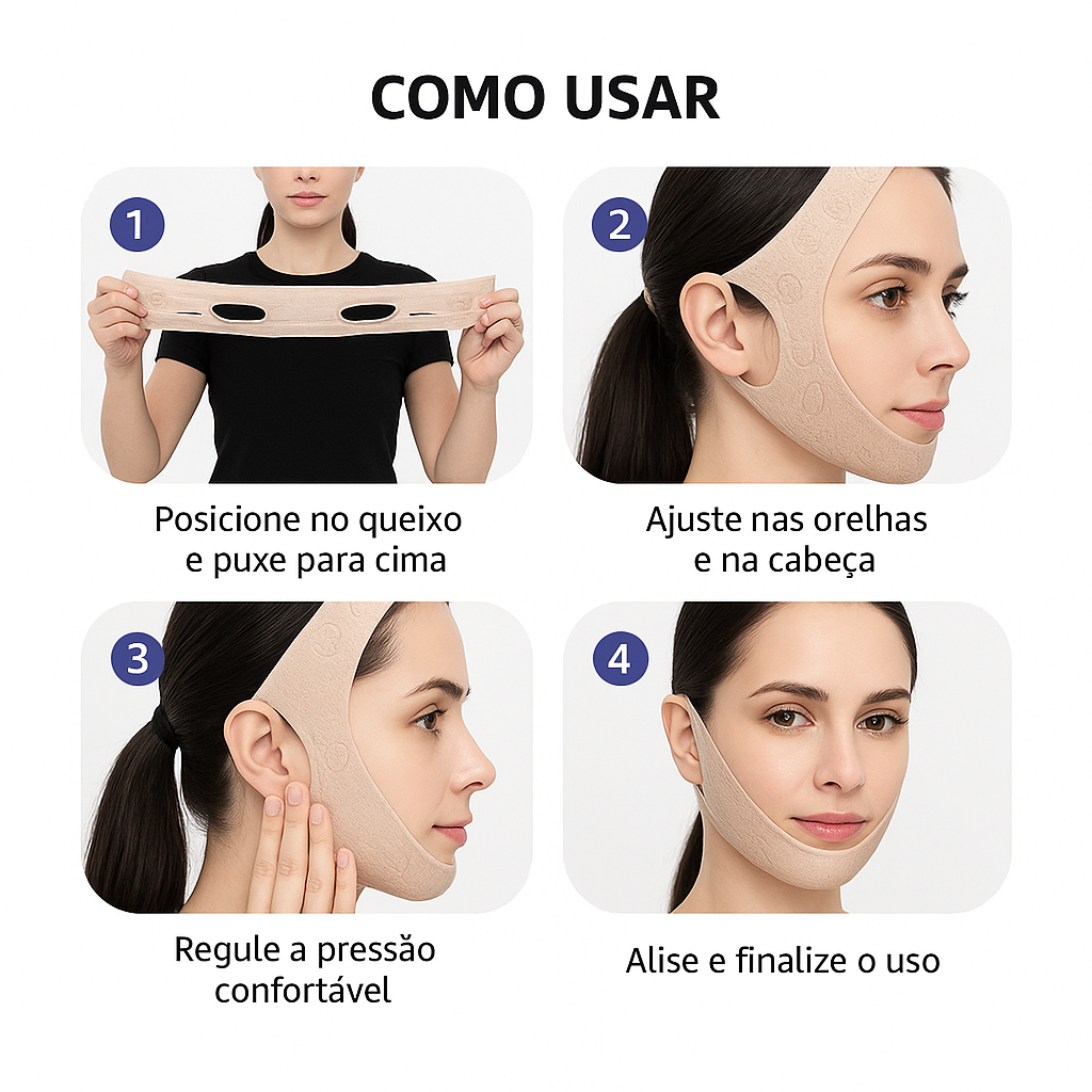 Nossa bandagem utiliza um sistema de correção física avançado. Com um corte de peça única e design ergonômico, ela envolve todo o rosto, aplicando uma força uniforme que puxa e levanta a musculatura masseter e o queixo. É o "treino" que seu rosto precisava para combater a gravidade.